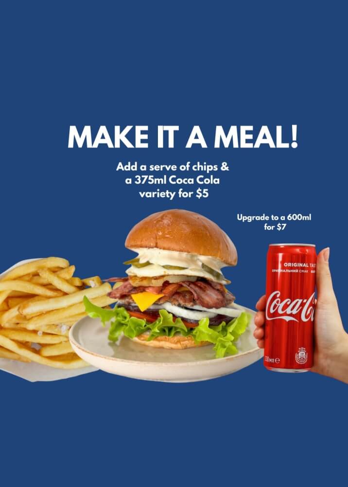 Burger meal deal. Chips and a can for $5 or upgrade to a 600ml $7