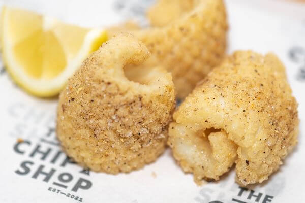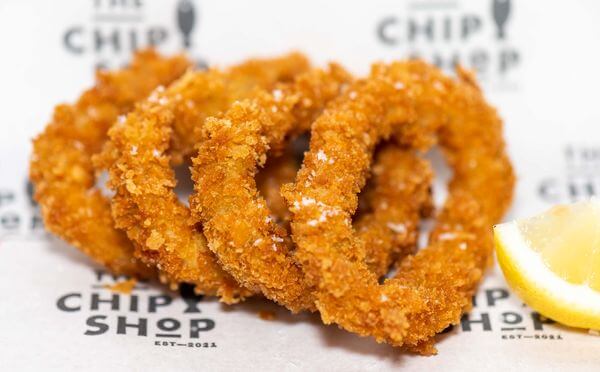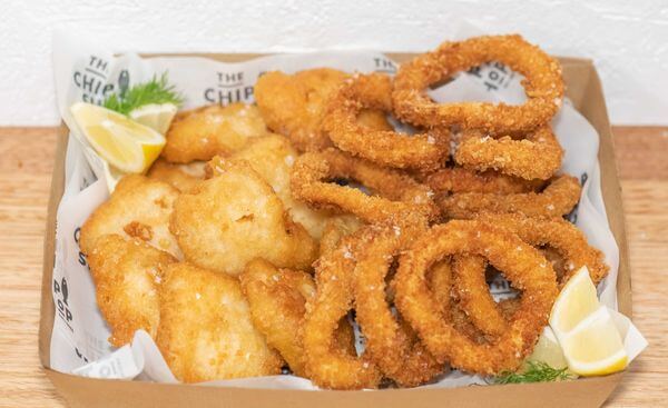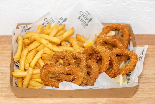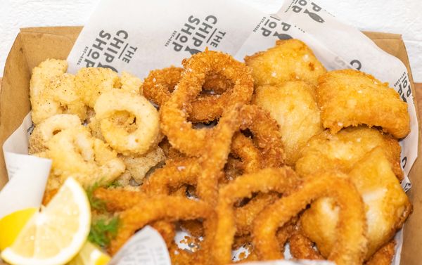 Large Chips, 5 x Fish Bites, 12 x Crumbed Calamari and 9 x Salt & Sichuan Pepper Squid