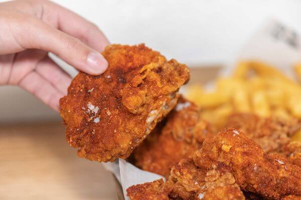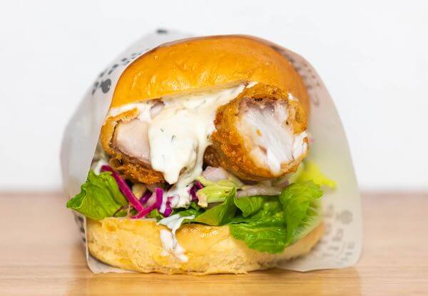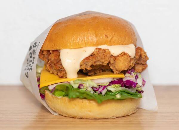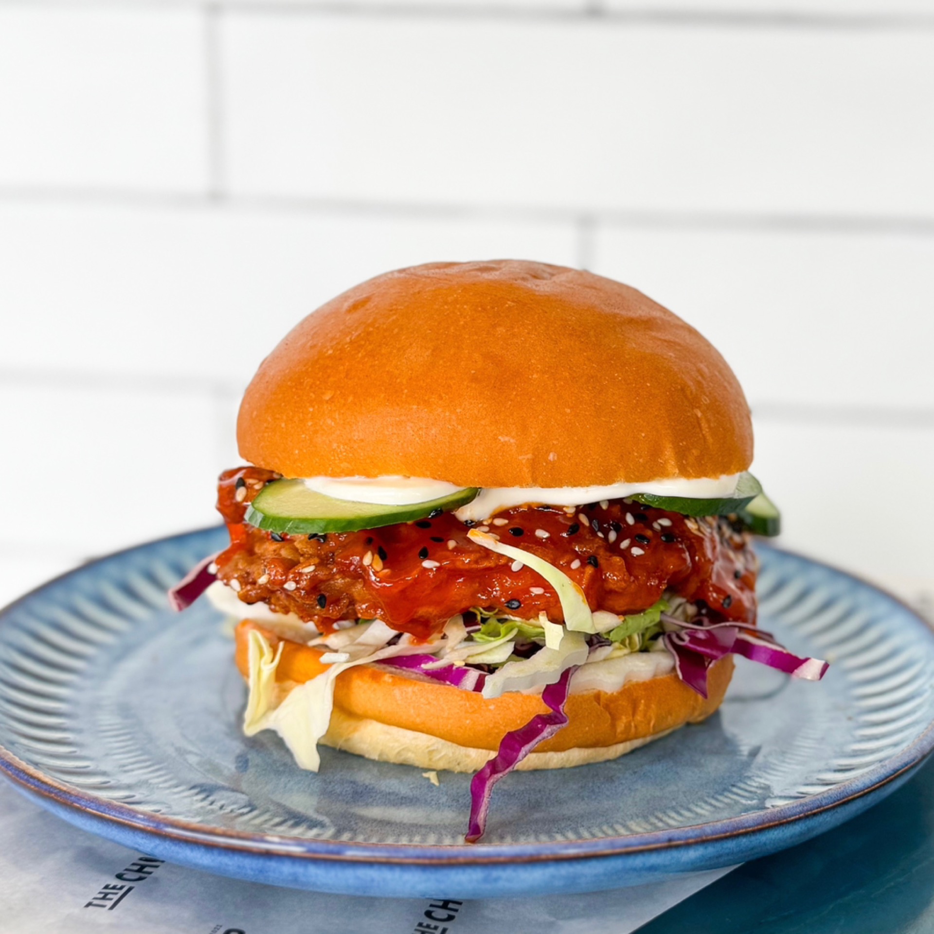 Buttermilk fried chicken, sweet and spicy gochujang sauce, sesame, slaw and mayo.