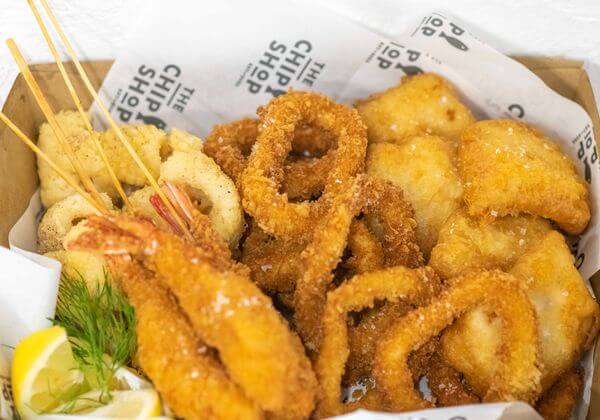 Large Chips, 5 x Fish Bites, 8 x Crumbed Calamari, 9 x Salt & Sichuan Pepper Squid and 4 x Aussie Prawns